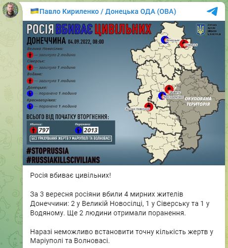08.15 В Донецкой области от обстрелов за прошлые сутки погибли 4 мирных жителя: 2 в Великой Новоселке, 1 в Северске и 1 в Водяном. Еще 2 человека получили ранения.