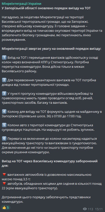- Выезд на временно оккупированную территорию (ВОТ) и перемещение грузов осуществляется в составе колонн через определенный КПП в Степногорске. Нужен пропуск комендатуры. Она действительна только в пределах Васильевского района.