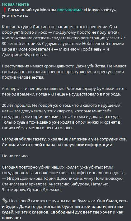 "Но "Новой газете" не нужны ваши бумажки. Она была, есть и будет. Даже тогда, когда не будет ни этой власти, ни этих судей, ни этих клерков. Свободный дух веет где хочет и как пожелает", - заявляет редакция газеты.