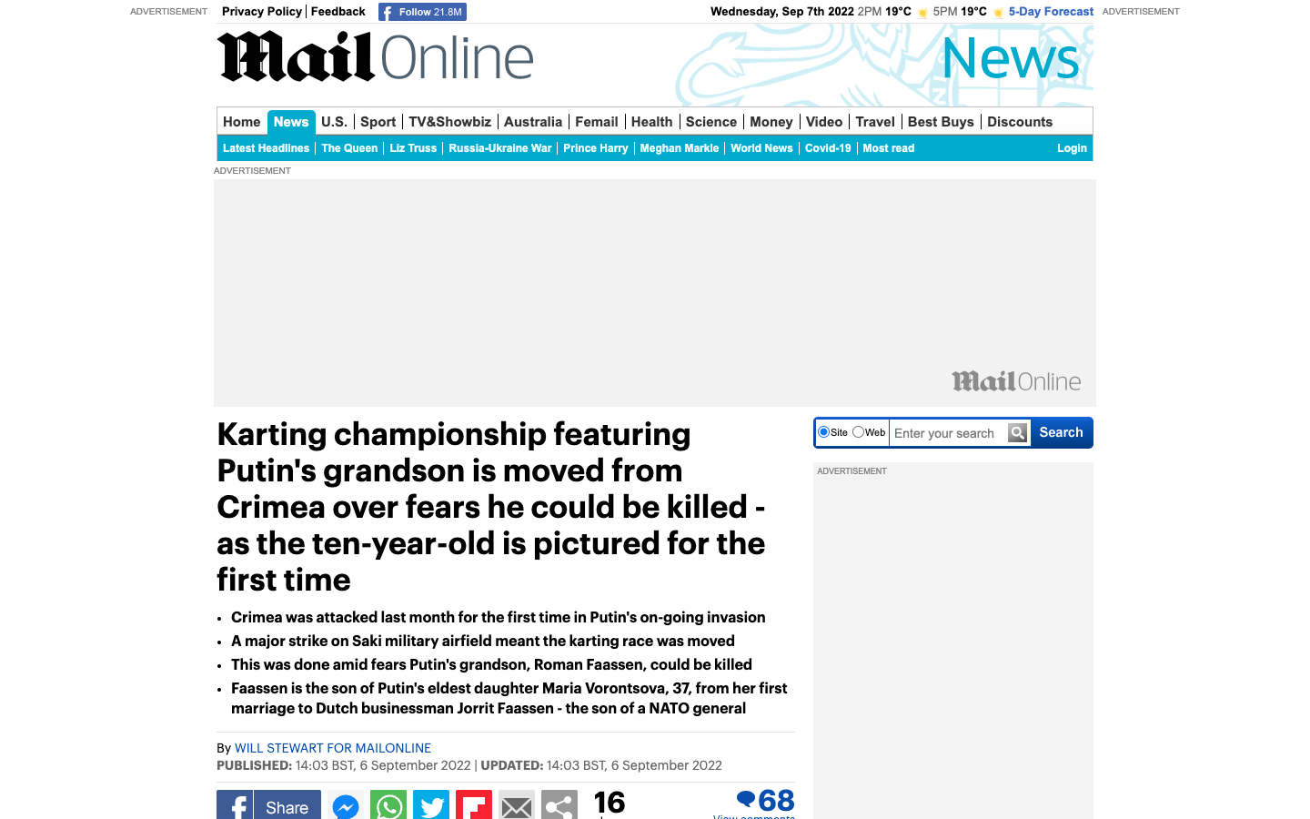 По информации издания, Роман Фаассен должен был участвовать в чемпионате по картингу в Крыму, но соревнования перенесли с полуострова из-за опасений, что ребенок может быть убит, так как его фото оказалось в сети.