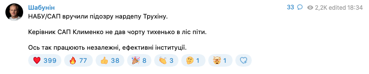 "Руководитель САП Клименко не дал черту тихонько в лес пойти", - написал Шабунин, сделав отсылку к скандальному видео с участием Трухина.
