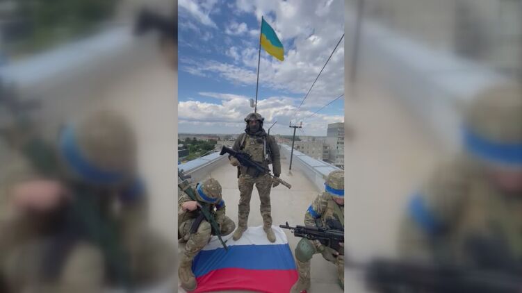 Появилось видео с украинскими военными, поднявшими флаг над зданием администрации Балаклейской общины.