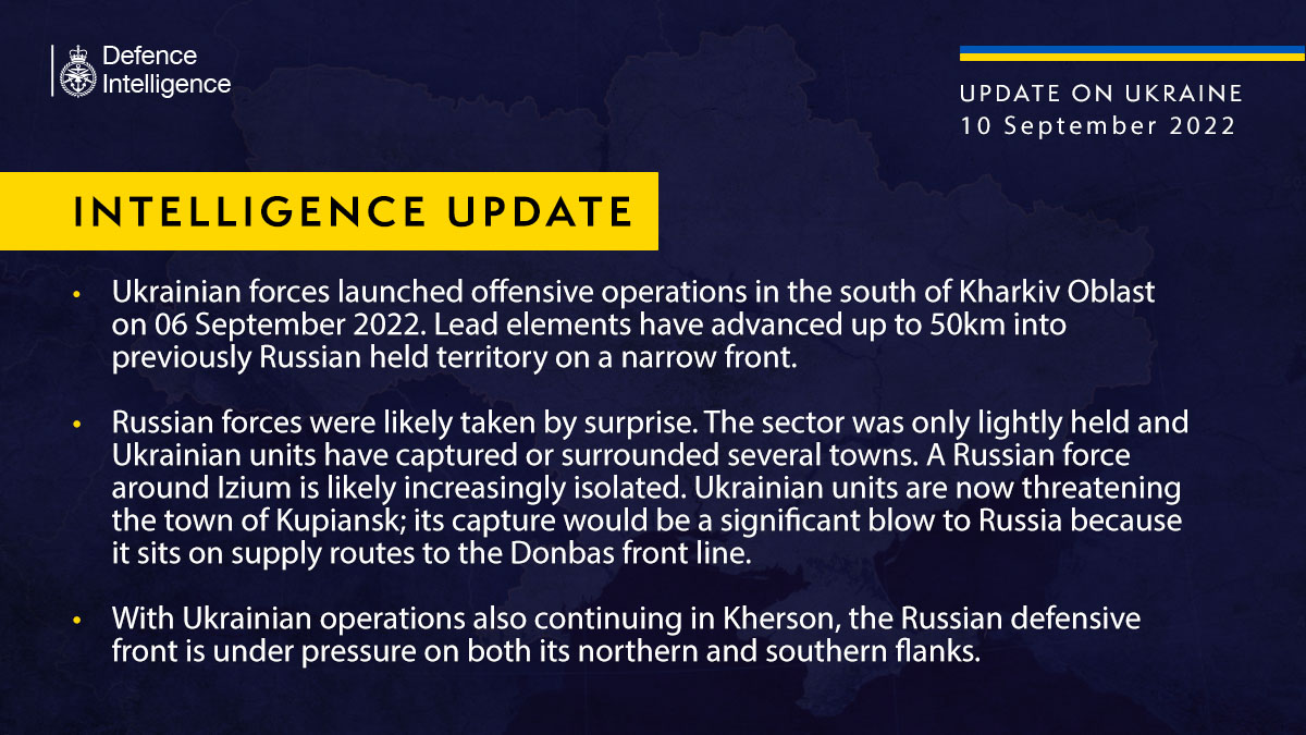 09:00 Британская разведка считает, что ВСУ застали врасплох российские войска на юге Харьковской области, где сейчас идет украинское наступление.