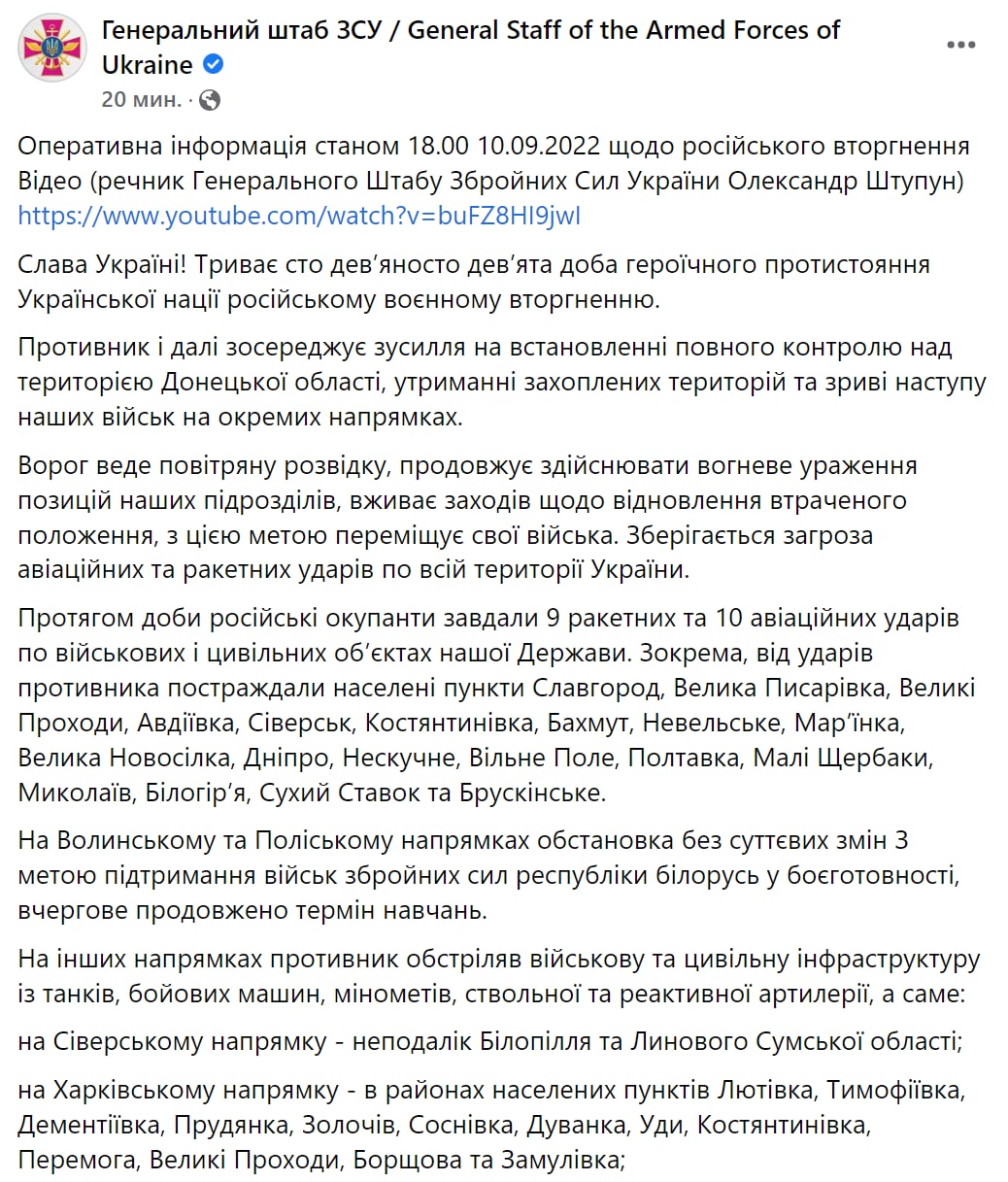 08:00 Сводка Генштаба ВСУ на утро 10 сентября. Главное: