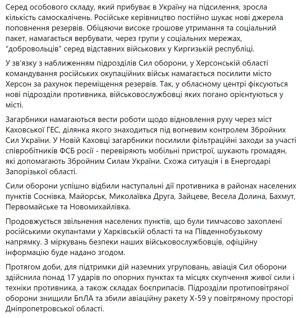 2. Командование российских войск пытается усилить город Херсон за счет перемещения резервов. Фиксируются новые подразделения противника, военнослужащие которых плохо ориентируются в городе.