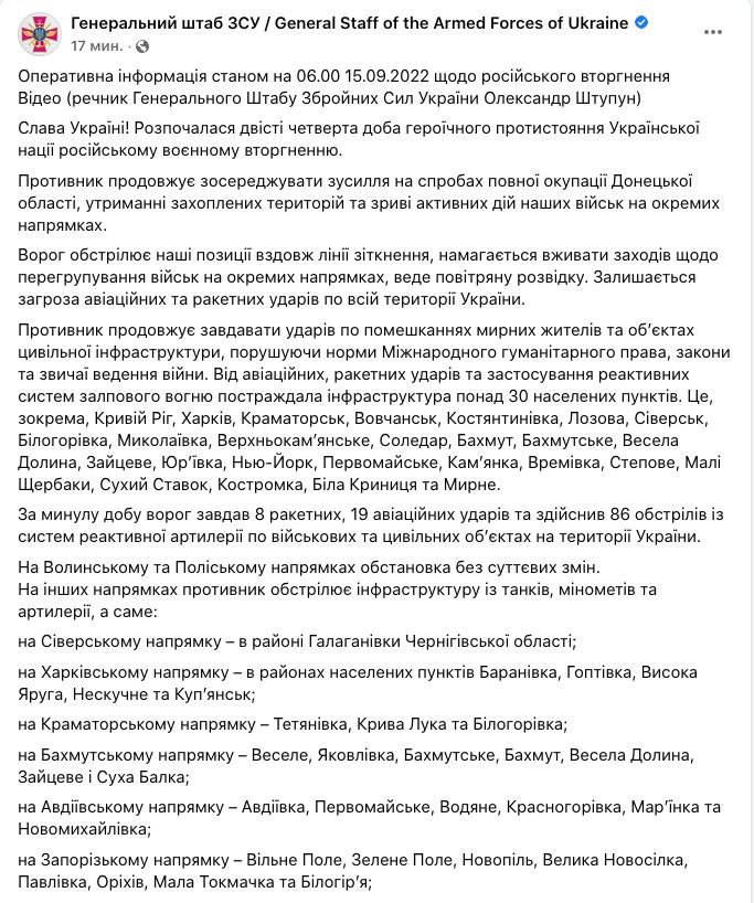 Война в Украине продолжается уже 204-й день. "Страна" следит за происходящим 15 сентября в обновляемом материале.
