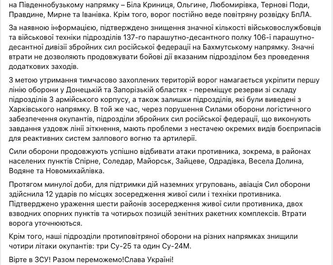 Дальше Генштаб сообщает о потерях десантных войск РФ под Бахмутом.