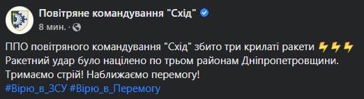 Удар был нацелен по трем районам Днепропетровской области, пишет командование.