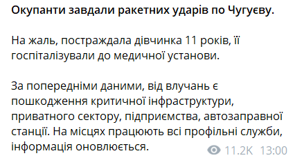 Днем в субботу, 17 сентября, войска РФ нанесли ракетные удары по Чугуеву. Пострадала девочка 11 лет, ее госпитализировали в медицинское учреждение.