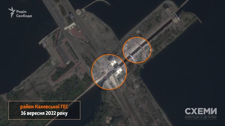 На спутниковом фото за 16 сентября видно место, где были затоплены вагоны. Именно там в итоге появилась насыпь. Также сервис Planet Labs зафиксировал рядом небольшие переправы на другую сторону Каховской ГЭС. На снимках за 2 сентября их еще не было, пишут "Схемы".