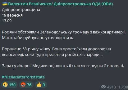 Днем 19 сентября россияне обстреляли Зеленодольскую громаду Днепропетровской области из тяжелой артиллерии.