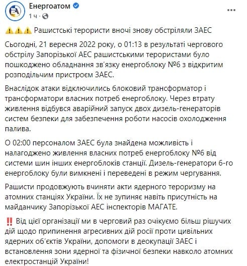 08:29 В ночь на 21 сентября под обстрел снова попала Запорожская АЭС. Повреждено оборудование связи одного из энергоблоков, сообщает пресс-служба Энергоатома.