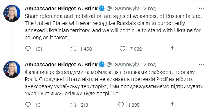 Посол США в Украине Бриджит Бринк заявила в Twitter, что "фальшивые референдумы и мобилизация - признаки слабости, провала России".
