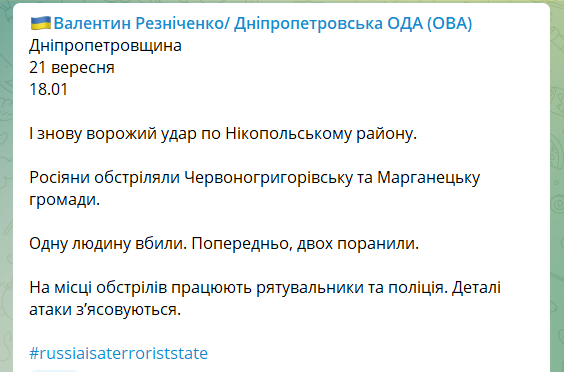 Российские войска 21 сентября дважды нанесли удары по Днепропетровской области, сообщил глава Днепропетровской ОВА Валентин Резниченко в телеграм-канале.