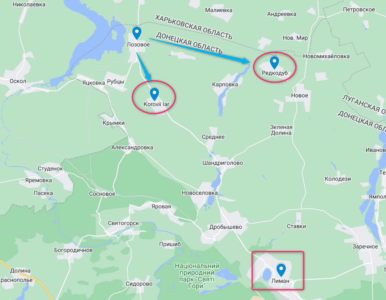Также российские телеграм-каналы сообщают о появлении украинских подразделений в районе Коровьего Яра - это южнее от Лозового, по дороге в сторону Лимана.