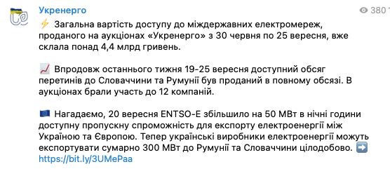 "За последнюю неделю 19-25 сентября доступный объем перетоков в Словакию и Румынию был продан в полном объеме. В аукционах участвовали до 12 компаний", - сказано в сообщении.