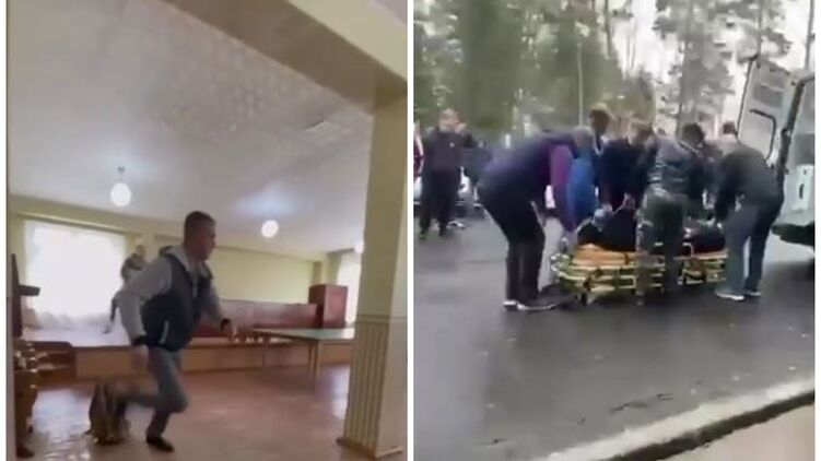 В российских пабликах появилось видео, на котором видно, как мужчина с оружием в актовом зале производит выстрел и выкрикивает: "Всем лежать! Всем на пол!" Присутствующие - разбегаются. После этого на кадрах видно, как в машину скорой помощи на носилках поднимают раненого.