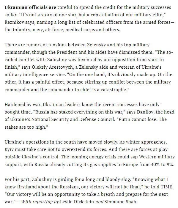 В материале Time, посвященном главкому ВСУ Валерию Залужному, затронута и тема конфликта Владимира Зеленского и главнокомандующего, слухи о котором курсируют уже несколько месяцев.