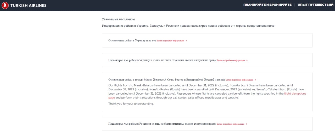 Turkish Airlines отменила все рейсы в Минск (столицу Беларуси) и три российских города - Сочи, Ростов и Екатеринбург до 31 декабря 2022 года.