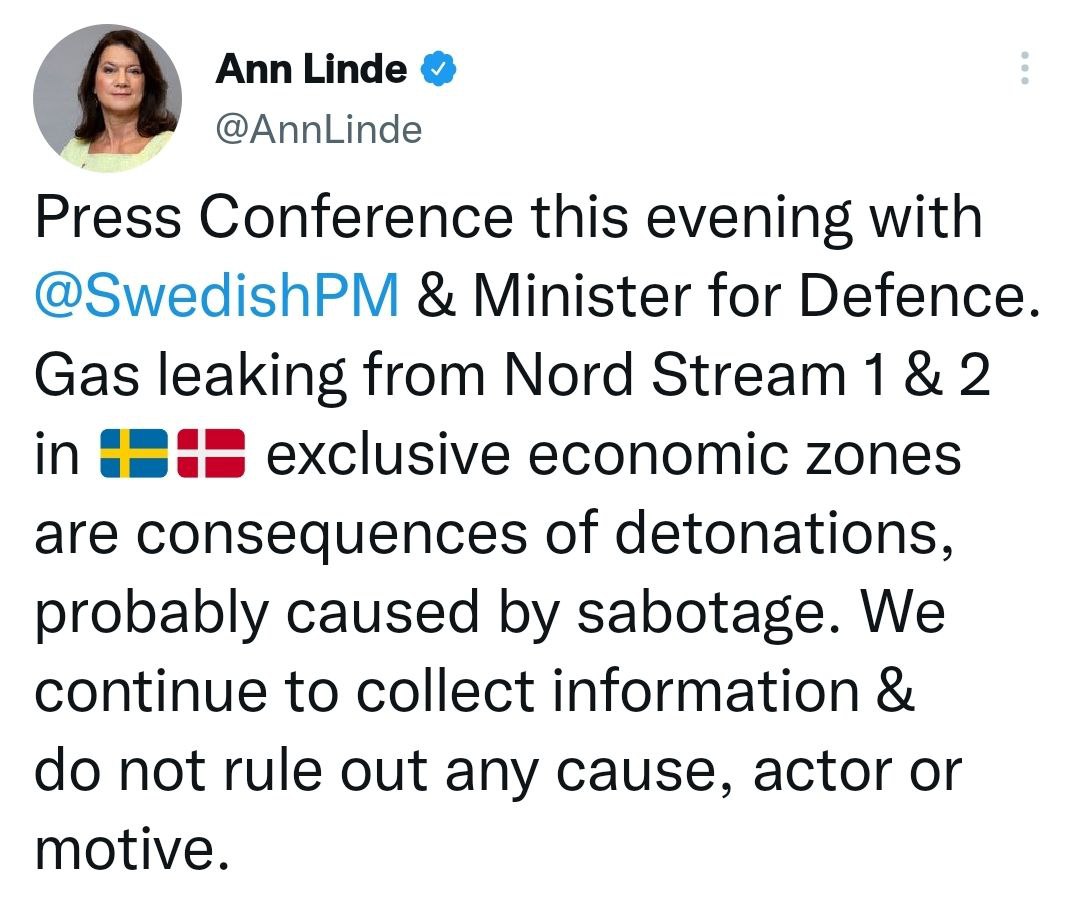 Министр иностранных дел Швеции Анн Линде заявила, что утечка газа "является следствием взрывов, возможно вызванных диверсией".