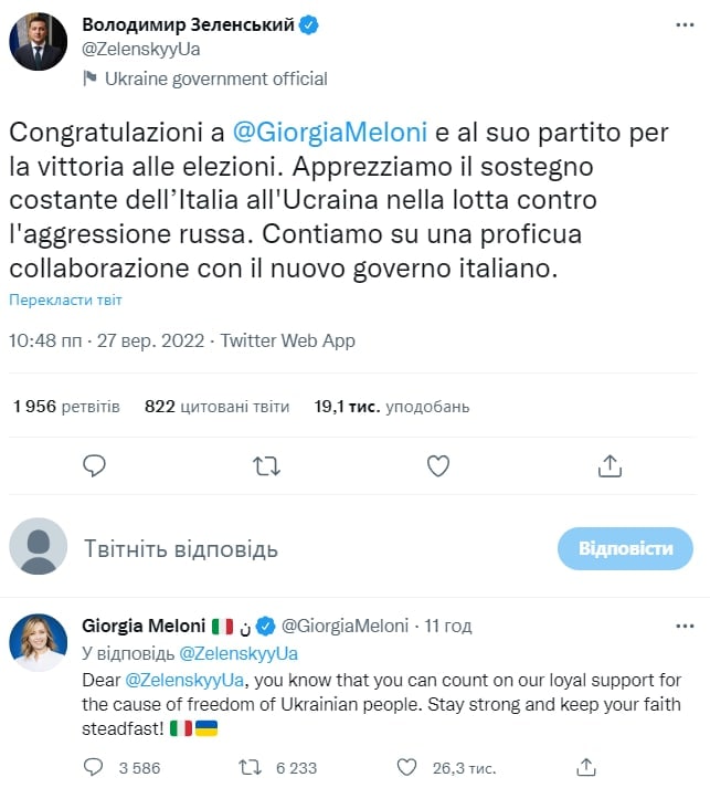 11.50 Лидер правой партии "Братья Италии" Джорджия Мелони после победы на выборах пообещала поддержку Украине.