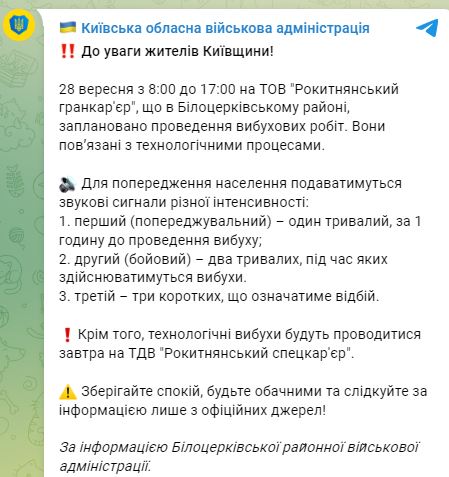 07.23 В Белоцерковском районе Киевской области сегодня будут проводить запланированные взрывные работы с 08.00 до 17.00. Жителей призывают сохранять спокойствие.