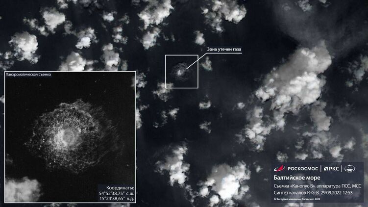 "Спутники "Роскосмоса" продолжают мониторинг утечки газа в газопроводах "Северный поток - 1" и "Северный поток - 2". Съемка космического аппарата "Канопус-В", - сказано в посте.