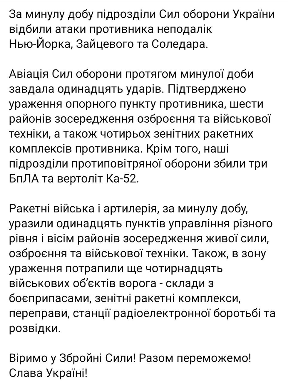 2. Украина отбила атаки противника в районах Нью-Йорка, Зайцево и Соледара. Количество населенных пунктов, которые атаковали российские войска, в новой сводке значительно меньше, чем в предыдущих.