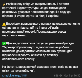 Как уже сообщалось, одна из пострадавших электроподстанций находится в Одесской области. Две ракеты, предположительно "Искандер", попали в объект промышленной инфраструктуры сегодня ночью 1 октября.