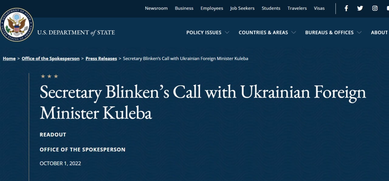 16.15 США и дальше будет помогать Украине вернуться в ее международно признанные границы, то есть - восстановить контроль над оккупированными территориями. Эту позицию подтвердил госсекретарь Энтони Блинкен в телефонном разговоре с министром иностранных дел Дмитрием Кулебой, распечатка которой доступна на сайте Госдепартамента США.