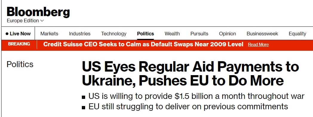 20:39 США готовы предоставлять Украине ежемесячную финансовую помощь в размере $1,5 млрд на протяжении всей войны, сообщает Bloomberg.