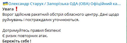 05.00 Рано утром Запорожье подверглось ракетному обстрелу РФ. Об этом сообщает глава Запорожской ОВА Александр Старух.