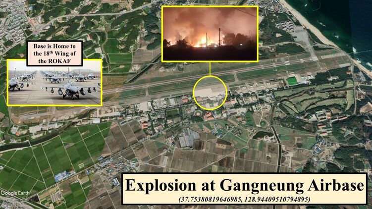 Пишут, что на этих видео – масштабные взрывы и детонация боеприпасов на авиабазе Каннын на побережье Японского моря, где дислоцируется 18-е авиакрыло ВВС Южной Кореи.