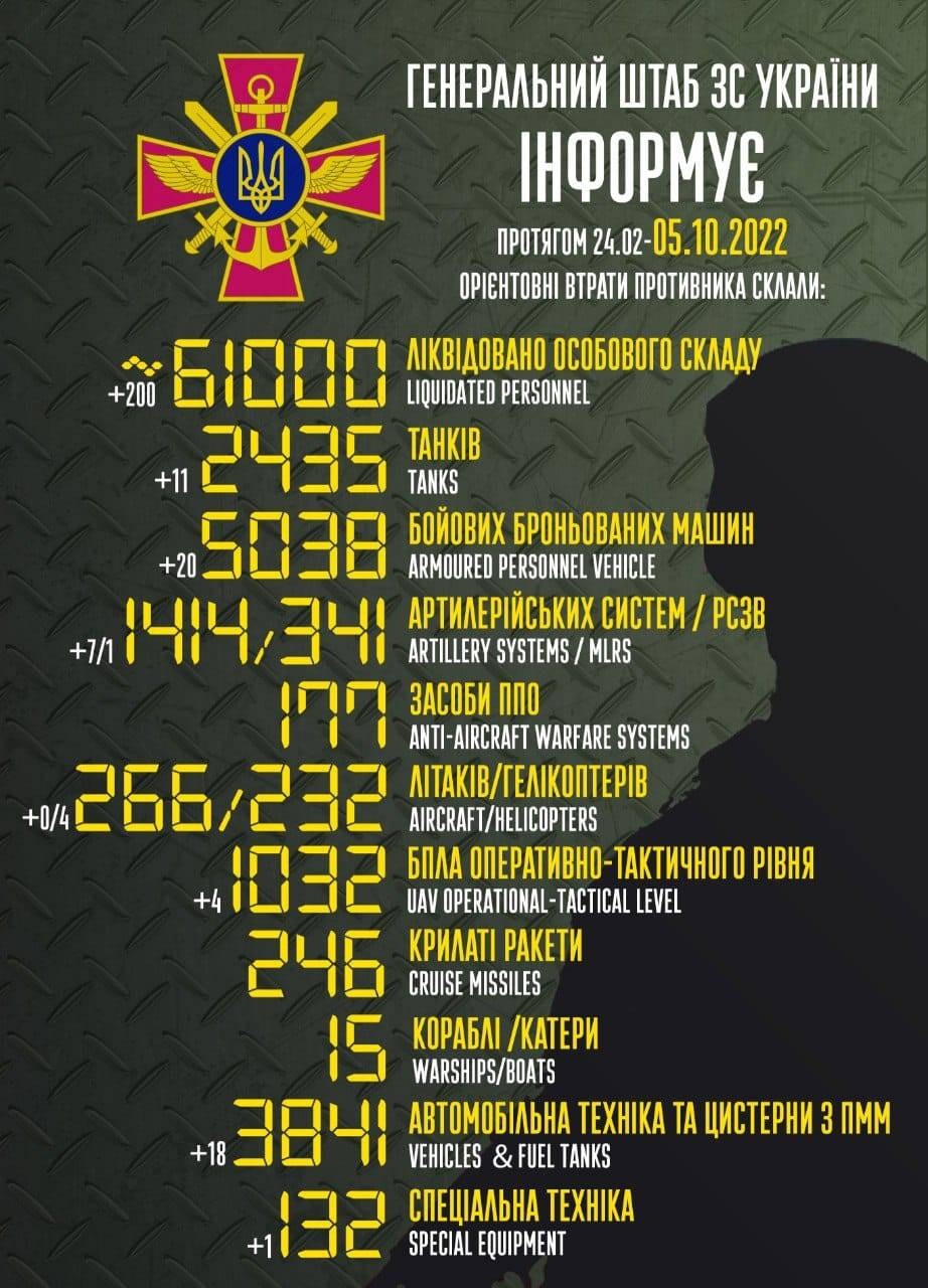 По состоянию на утро 5 октября армия РФ уже потеряла 61 тысячу военных с начала полномасштабного вторжения 24 февраля.