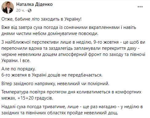 Синоптик Наталья Диденко пишет, что в Украину сегодня зашло "бабье лето".