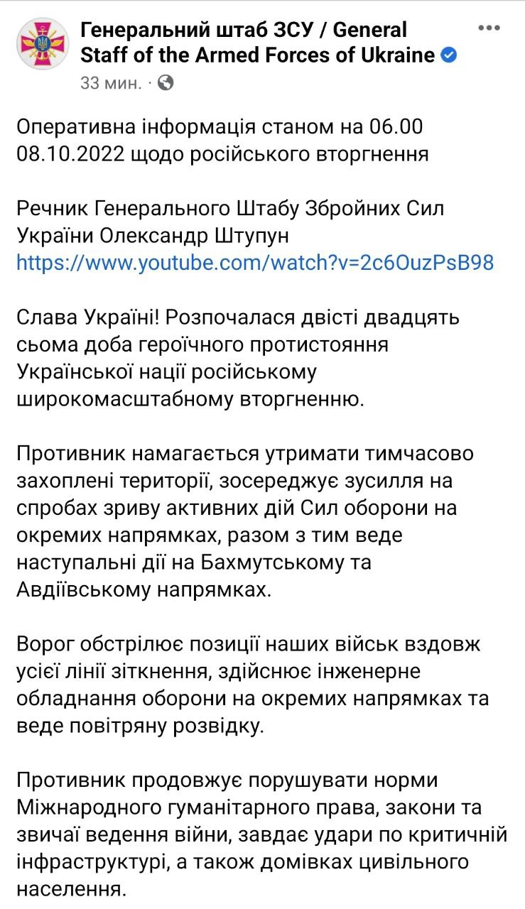 В Генеральном штабе Вооруженных сил Украины опубликовали оперативную сводку с фронта по состоянию на 06:00 8 октября. Со вчерашнего вечера мало что изменилось. Сообщается, что украинская армия обороняется под Бахмутом и Авдеевкой, а российские войска применяют иранские дроны для ударов по Запорожью и Николаеву.