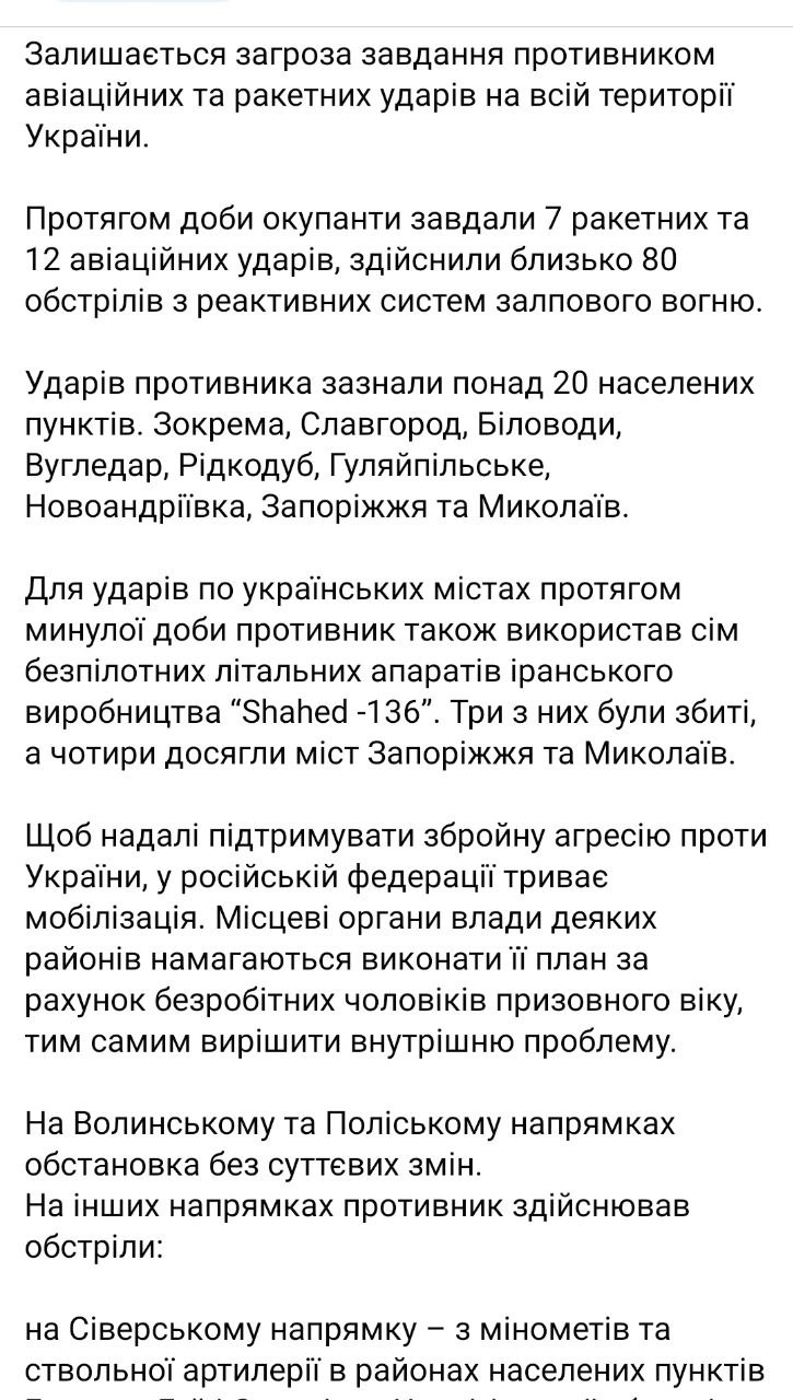 1. За минувшие сутки противник применил семь беспилотников "Шахид", три из них были сбиты, а четыре смогли нанести удар по Запорожью и Николаеву.