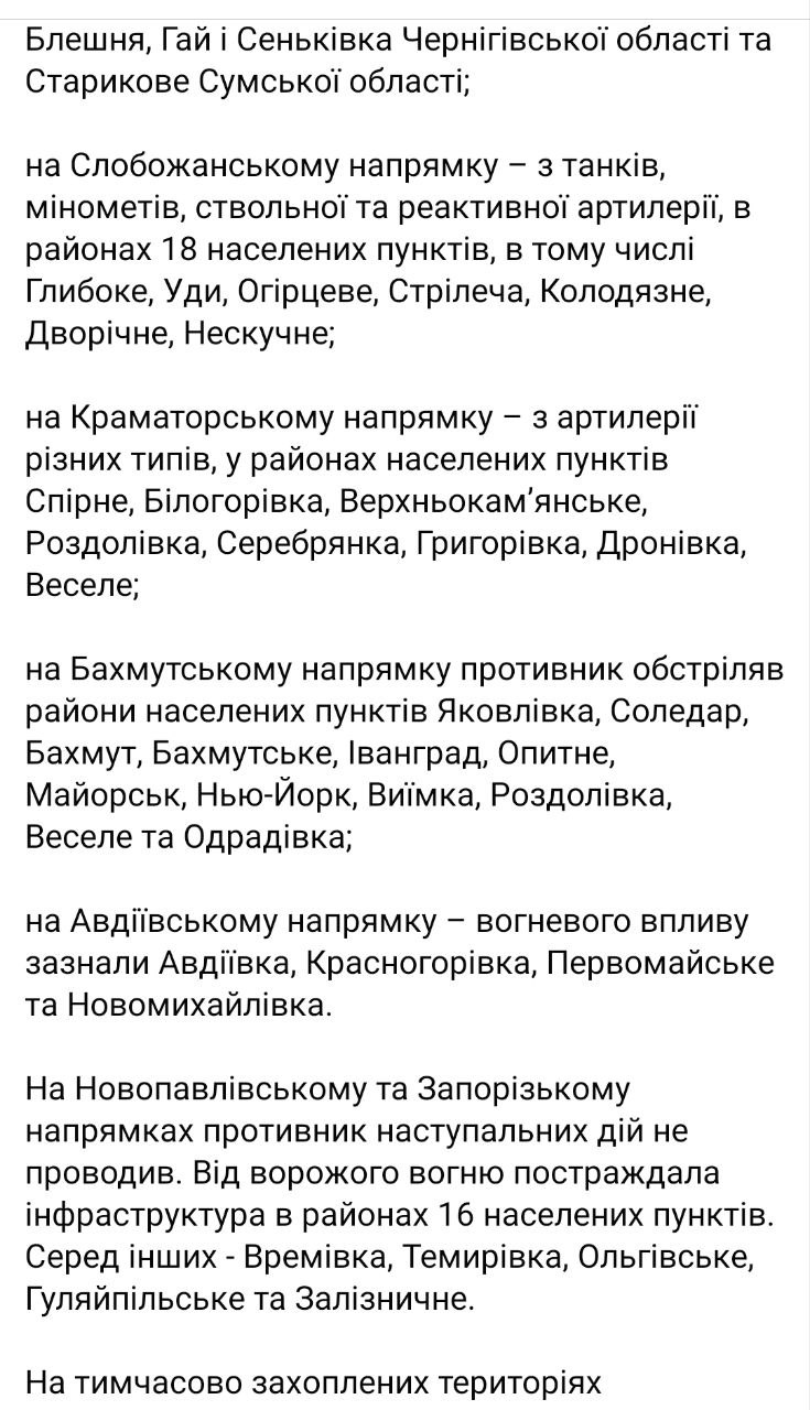 2. Отбиты атаки россиян в Бахмуте, Бахмутском, Выемке, Зайцево (взятие которого декларировала Россия), Красной Горе, Майорске, Озеряновке, Отрадовке, Андреевке, Первомайском, Красногоровке, Веселом, Каменке, Победе, Невельском, Новомихайловке и Терновых Подах.