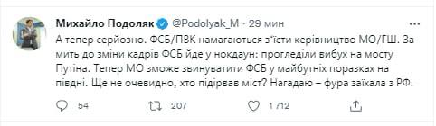 Как считает Подоляк, взрыв на мосту на руку военным, так как тогда виновной за провалы на фронте будет ФСБ, не обеспечившую безопасность такого стратегического объекта.