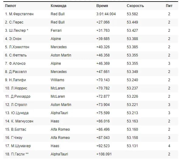 В итоге победил Ферстаппен, на втором месте оказался Серхио Перес (+27.066), на третьем - Шарль Леклер (+31.763), который на финальных метрах дистанции срезал шикану, получил 5-секундный штраф и откатился на третье место.