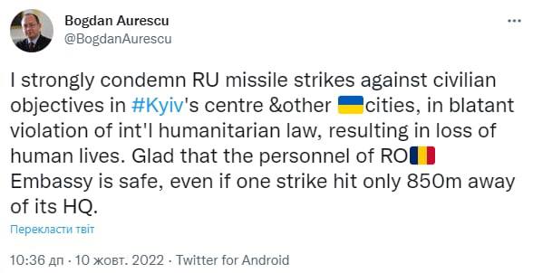 "Рад, что персонал посольства Румынии в безопасности, несмотря на то что один удар был нанесен всего в 850 метрах от его здания", - написал он.