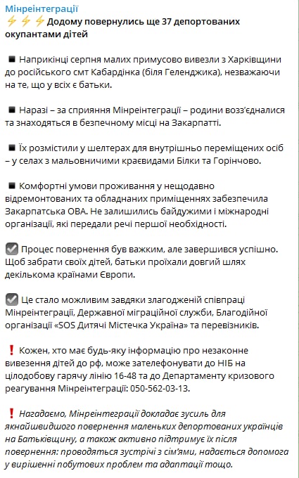"Домой вернулись еще 37 депортированных оккупантами детей. В конце августа малышей принудительно вывезли из Харьковской области в российский пгт Кабардинка (возле Геленджика), несмотря на то, что у всех есть родители", - рассказали в ведомстве.
