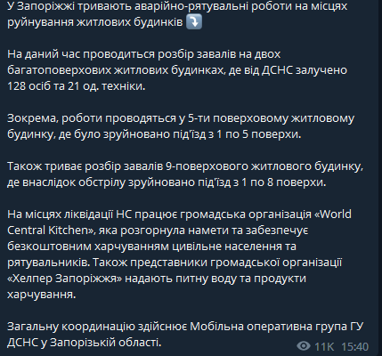 "В настоящее время проводится разбор завалов на двух многоэтажных жилых домах, где от ГСЧС привлечены 128 человек и 21 ед. техники. В частности, работы проводятся в 5-ти этажном жилом доме, где был разрушен подъезд с 1 по 5 этажа. Также идет разбор завалов 9-этажного жилого дома, где в результате обстрела разрушен подъезд с 1 по 8 этаж", - говорится в сообщении.