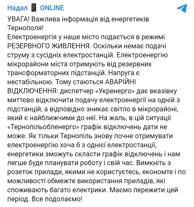 Тернополь оказался отрезан от электростанций, в городе происходят стихийные отключения света - мэр