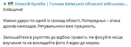 "Киевщина. Есть удары по одной из громад области. Предварительно – атака дронов-камикадзе. Спасатели уже работают" - написал глава ОВА.