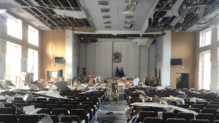 В сети появились фото, показывающие последствия прилета по двору здания Донецкого горсовета, которое сейчас занимает "городская администрация", назначенная "ДНР".