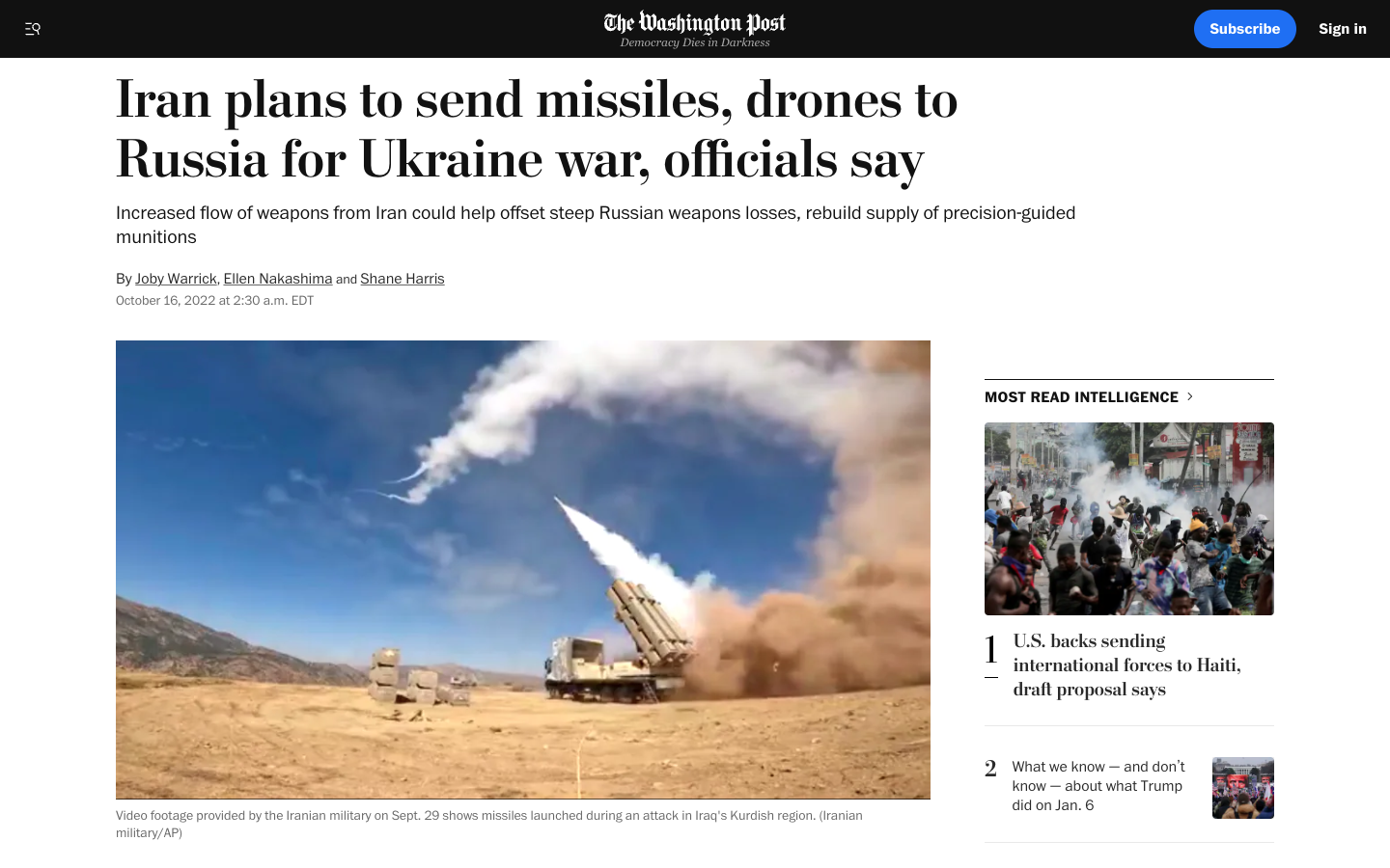 Иран намерен поставлять в РФ не только дроны, но и баллистические ракеты - WP