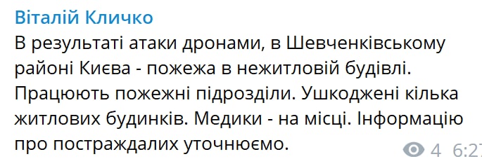 07:11 Кличко подтверждает ещё один прилет в Киеве в Шевченковском районе.