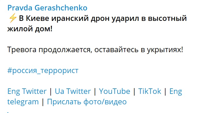 08:45 Советник главы МВД Антон Геращенко пишет, что в Киеве дрон попал в жилую высотку.
