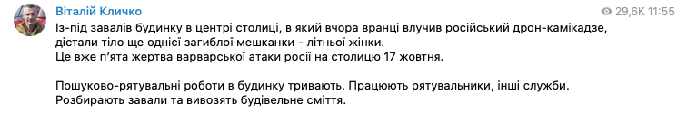 В Киеве из-под завалов дома на Жилянской, куда вчера утром ударил российский дрон-камикадзе, извлекли тело пожилой женщины. Это уже пятая жертва атаки.